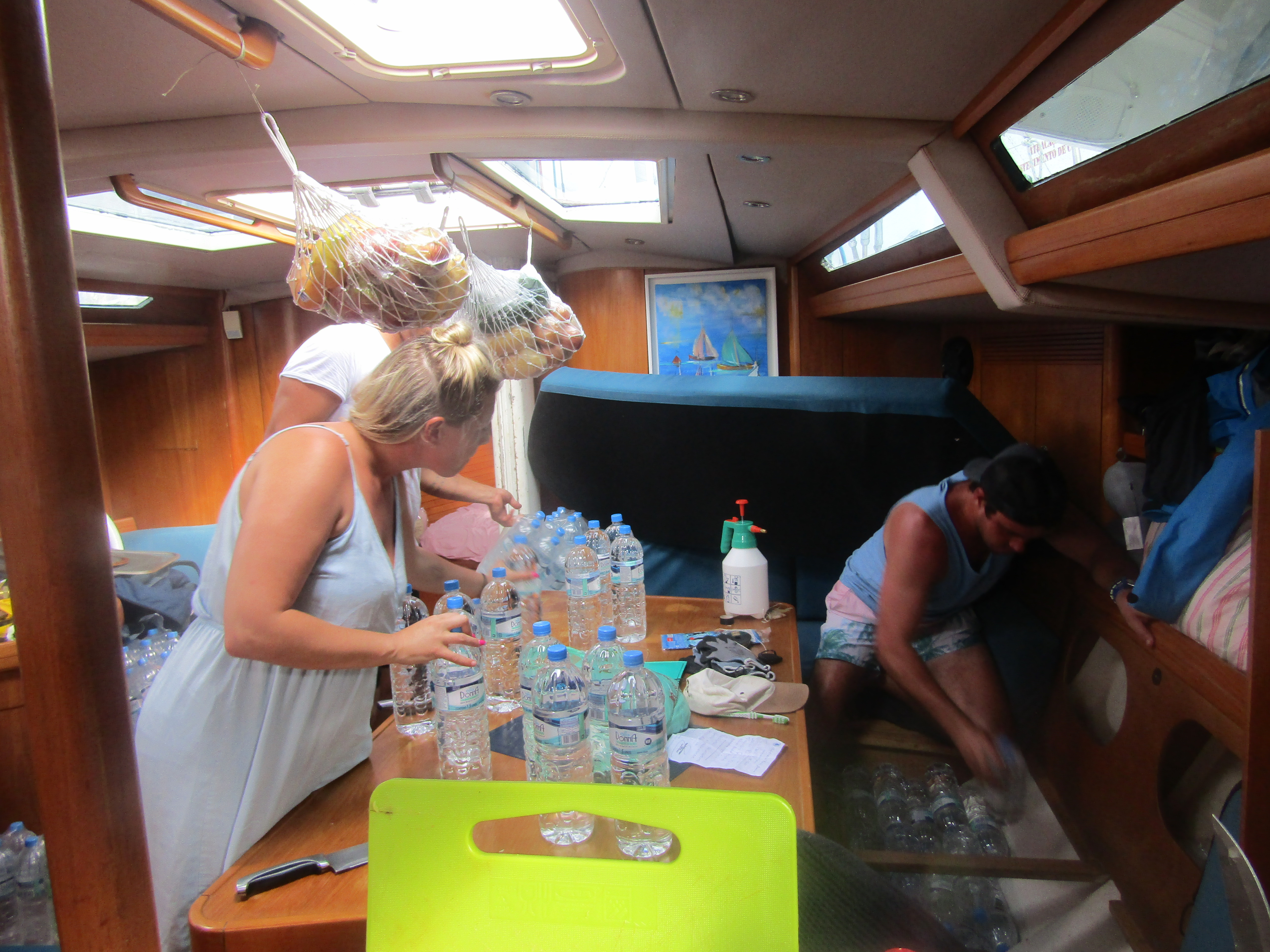 Water. A huge problem for us as the tanks did not have the capacity we are used to on our own boat. Work it out. Most people need 1.5 – 2 litres a day, figure out the best option for the boat in terms of storage.