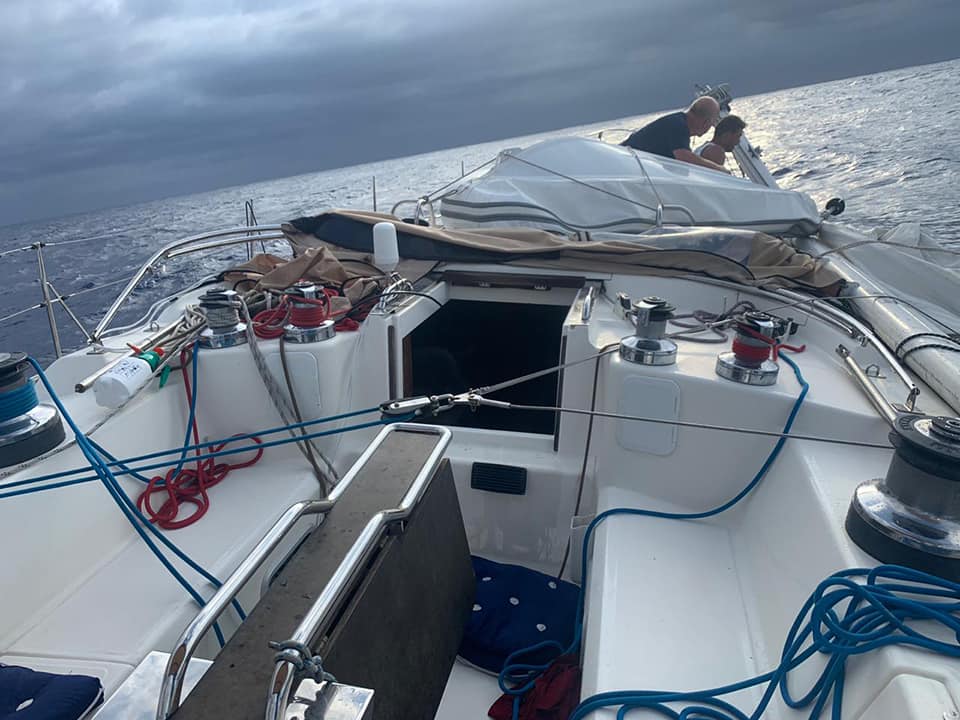 Anyway, around 2 pm. I notice the sea state has changed a bit, instead of the waves all going in one direction they seem to be coming from both left and right. Ask Junior (on watch) why this has happened and he says he is aware of it, there are 3 signs he is looking for and he is waiting for the third sign as he has seen the first 2….??? At this moment Captain Mike, who had been sleeping, pops his head out and says “What’s happening?” Within a few seconds he was on deck shouting at Junior to “drop the mainsail NOW”, Junior ran forward but the bloody sail wouldn’t drop, Michael ran forward to help and they roughly secured the sail with a rope, lazy jacks were not working. The fact that Michael woke up from a sleep because he felt a change in the sea is a testament to his natural sailing ability, his instincts, plus years of experience. It amazed us all and undoubtedly saved us from certain immediate disaster. The wind that hit us 5 minutes later could have knocked us down if we had left the full main sail up.