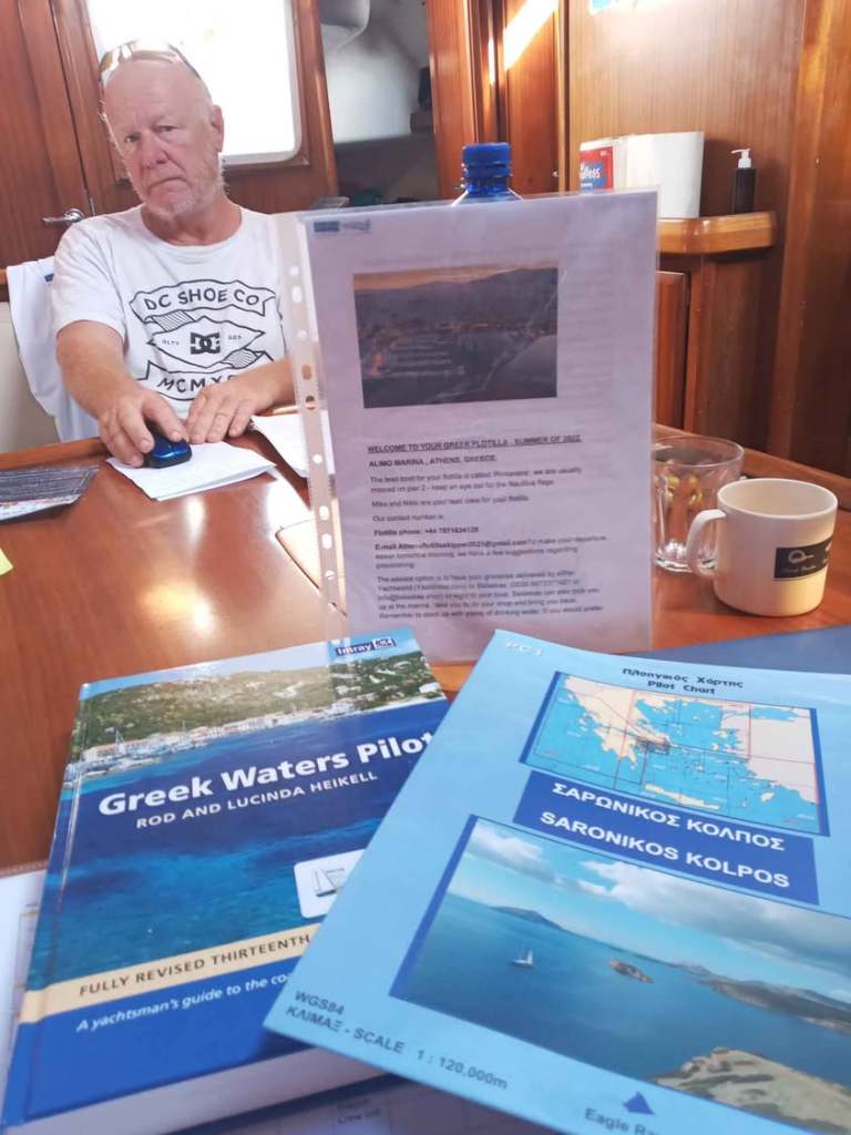 Prepare Sunday briefing with the rules for the week, to be delivered to skippers at 9 am tomorrow morning. Prepare info and briefing on Methana, our first stop on Sunday evening, what type of moorings, where we are having dinner, etc. (Babis, pre-booked).